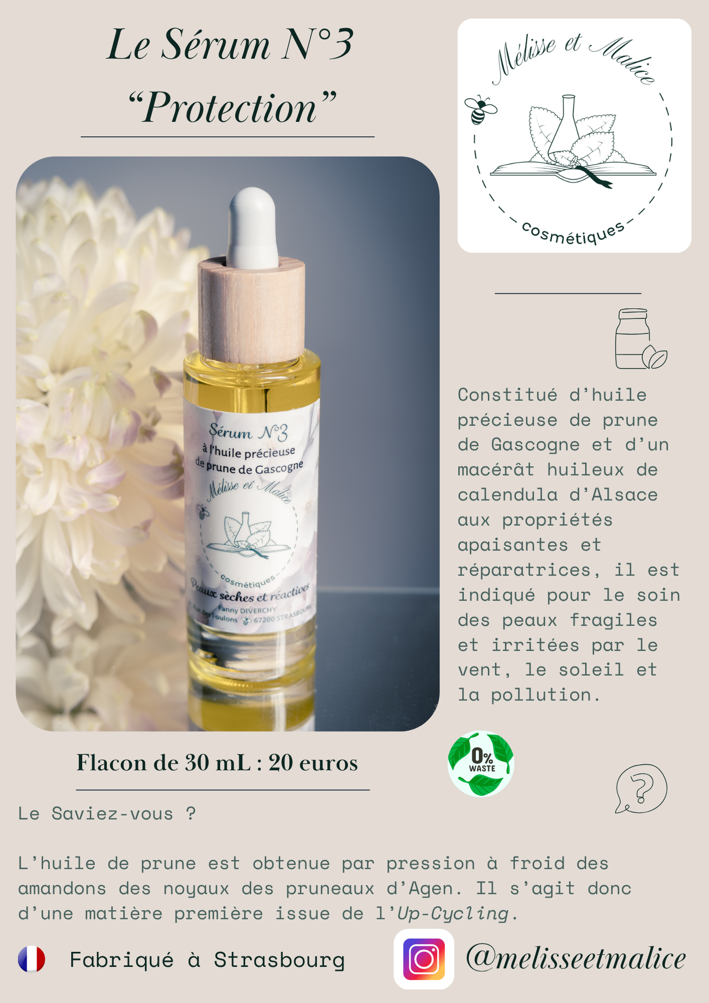 Sérum N°3 : Helianthus annus hybrid seed oil*, Olea europaea fruit oil*, Prunus domestica seed oil*, Calendula officinalis extract*, Corylus avellana seed oil.