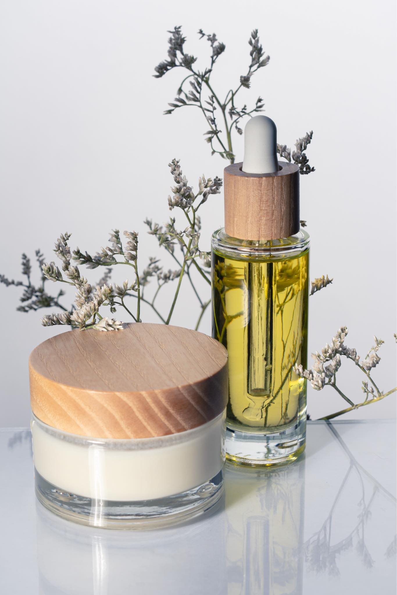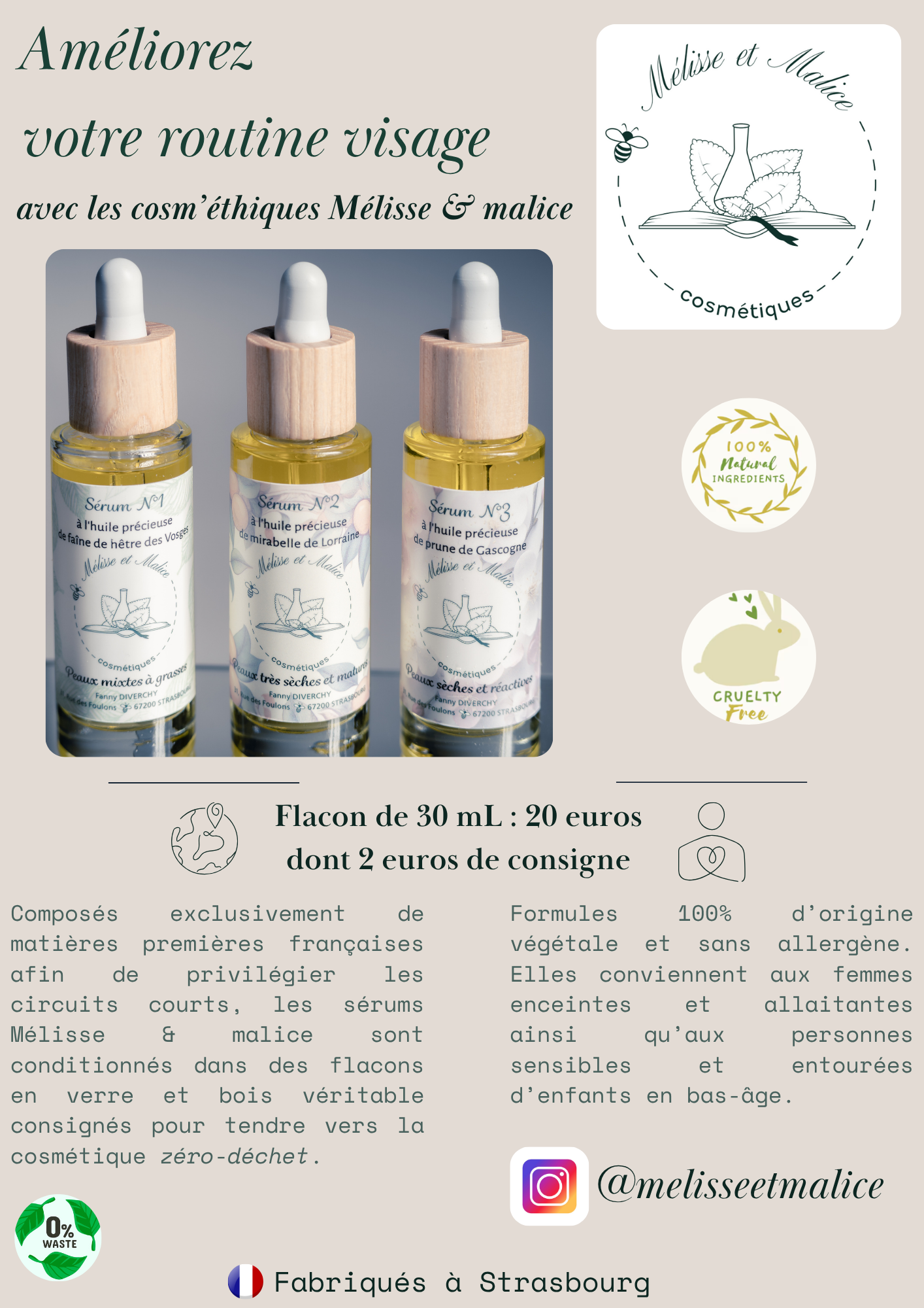 🍃 Pot et flacons en verre et bois véritable de 50 et 30 mL respectivement pour 3 à 6 mois d'utilisation chacun.
